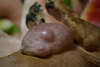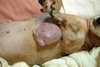 写真は腫瘍。 リンパ節に転移の疑いあり、反対側にちっさいのがすでにあるんだけれど、この数ヶ月で大きさや形状に変化が見られたのはここだけ。左下のぽこっとしてるのが、恐らく原発ちゃんです。 前回はここから自壊したんだけれど、今回はこんなサイズになってなお中央やや左下が腫れる程度で自壊しませんでした・・・。